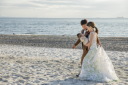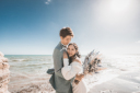 海岸へご移動して砂浜で夕日とのお写真、ヘアはふんわりとしたハーフアップにブーケとお揃いのフラワーパーツをつけて