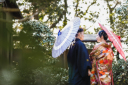 お二人で和装らしい番傘のショット、和装撮影では外せない素敵なショットです