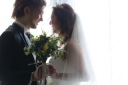 お嫁様の振り返り。上から撮影をすることで自然と上目遣いに。新郎様からのあつい視線に思わずほころぶ笑顔がとっても素敵です♪