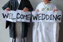 お持ち込みのブーケとブートニア、ヘアオーナメントもお似合いです。息ぴったりの振り返りショット。