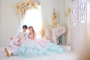 洋装はホワイトベル浜松にて撮影させていただきました。ボリュームあるオフショルダーにスレンダーなドレス&ほんのりクリーム色の王道タキシード。