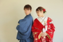 和装の定番でもある正座ポーズをシンプルな背景の前で。年賀状・お写真立て・結婚式のウェルカムスペースなど色々なシーンに使える1枚♡