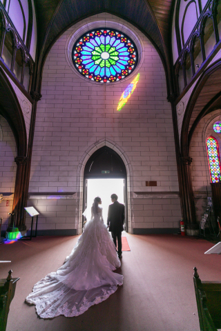 明治村内のいろいろなところで撮影してくださり、桜の前では可愛らしいショットを、教会では大人っぽいショットを撮ってくださりました。 教会のステンドグラスの明かりが綺麗に入った写真が特にお気に入りです。