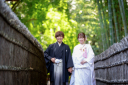 それぞれ番傘を使用して、緑の中に紅白の傘が映えますね!手を繋いで可愛い雰囲気もバッチリです。