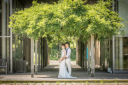 明るい自然光の中での撮影。白のウェディングドレスにぴったりです。