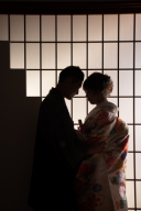 シックな背景と着物。ドライフラワーとブーケで神秘的な雰囲気です。