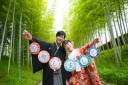 ご新婦様のお1人のお写真です。素敵なお着物なので後ろ姿もお撮りします!ゴールドの打掛が竹林に映えますね☆