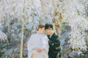 舞鶴公園の桜を背景に、感動の瞬間を再現。白無垢と紋付袴が青空に映え、まるで映画のワンシーンのようなドラマチックでロマンチックな雰囲気を演出します。