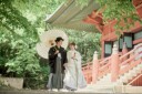 白無垢と黒紋服の気高い装いが、自然の緑と木造建築の温もりに溶け込みます。寄り添うその姿は、古き良き日本の美と新しい人生の始まりを象徴する一枚になりました。