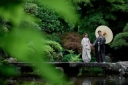 歴史ある建物と手入れの行き届いた庭園が美しい、富岡市社会教育館。番傘を手に、自然に笑い合うおふたりの姿がとても印象的です。