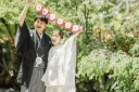 八重桜に囲まれての1枚。おでこを合わせると照れくささがありますが、初々しさがまたいいですね♡
