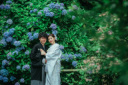 白無垢にお色直しをし2ヶ所目のお寺での1枚。こちらは別名『鎌倉花のお寺』といわれている寺院。鎌倉らしく自然に囲まれた中にあるお寺なので和装が良く映えます。