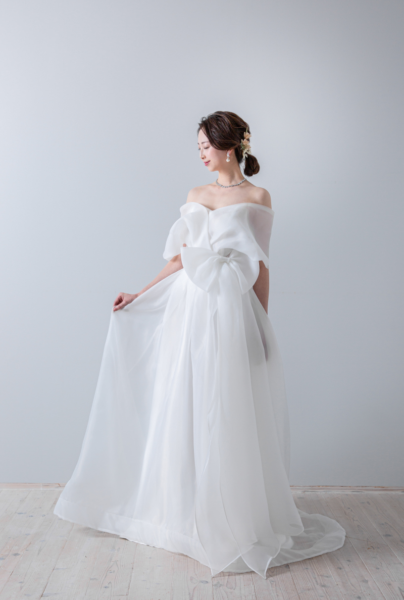 胸元のチュールリボンのデザインが可愛らしい印象のドレスです。軽やかでボリュームのあるオフショルダーが後ろからのシルエットも美しく魅せてくれます。