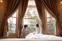 綺麗な赤いリングケースが新婦様の白いウエディングドレスに映えています。後ろからそっと新郎様の手が支えます。