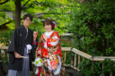 参道から本殿へは紅葉のトンネルをくぐります。赤やグリーンの紅葉を背景に新婦様の白無垢が映えます。