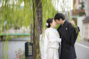 「LOVE」の赤い糸を町屋をバックに。町屋の壁色がLOVEの赤色を引き立てていますね!