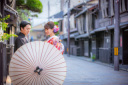 白傘をさして二人で町屋をお散歩します。よ~~いドン!