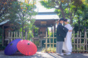 清らかな白川の流れが美しいショットです。新郎様が赤い傘、新婦様が青い傘でこの組み合わせも素敵