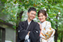 お二人でやさしくボールブーケを見つめて。バックの木々に木漏れ日が光って綺麗な一枚です。