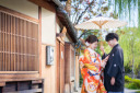 趣のある祇園の街並みは和装にはとてもあいます。新郎様の青傘が茶色の街並みに映えていますね。