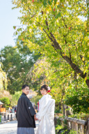 柔らかな日差しが和傘からお二人へと降り注いでいます。にこやかに微笑みあうお二人が綺麗です。