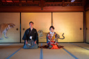 新婦様の色打掛はオレンジから深いグリーンにグラデーションになっています。特に引いた写真ではその美しさが目立ちますね。