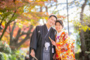 選ばれた青い色打掛がバックの紅葉に映える綺麗なショットです。