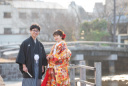 鴨川沿いに降りてきました。後ろ姿は衣装の柄がとても綺麗に見えます!