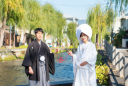 オレンジの紅葉、朱色の玉垣に灯籠、華やかな色打掛。とても鮮やかな一枚です!