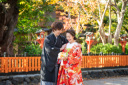 オレンジ色に染まった紅葉と一緒に新婦さまのソロショットを撮影です。