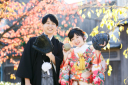 白い和傘をお二人で♡頭上には黄色と緑が混ざった葉っぱたちがゆらゆら。