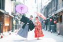 知恩院の古門をバックに見つめ合ってにっこり♡和傘も素敵ですね。