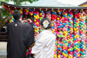 髪飾りに差し色の青がとても映えますね。とてもおしゃれです。