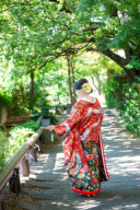 日本庭園にやってきました。下にいくにつれてピンクから赤にグラデーションの色打掛です。
