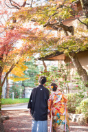 色打掛にお着替えして日本庭園にやって来ました。こちらも色鮮やかです。