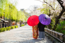 和傘を使って撮影です。赤と青と白の和傘を自由に使っていただけます。