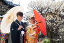 春霞のかかった明るい空には遠くに重厚な門がそびえたっています。和装撮影にふさわしい背景でお二人の雰囲気もとっても良いですね。