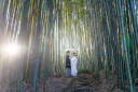 新婦様の綺麗な一人ショットは緑の新芽のシャワーを浴びて。この時期ならではの季節感あふれる写真が撮れます。緑と白で大変綺麗な写真ですね。