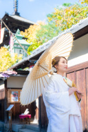満開の桜をバックに幸せ笑顔の可愛い新婦様です。薄ピンクを背景にオレンジを基調とした花柄の色打掛が鮮やかですね。