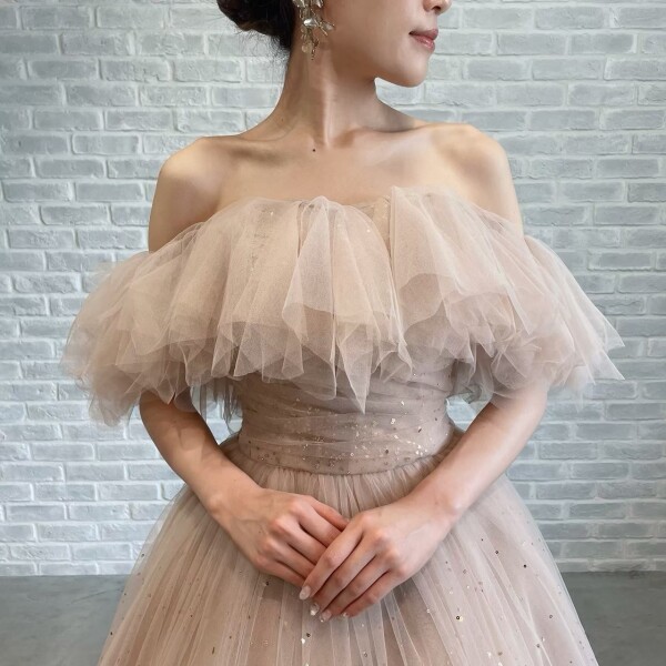 モカベージュの優しい色合いにゴールドカラーのスパンコールが合わさり、キラキラと輝きを放つのが特徴。ニュアンスカラーを求めつつ、デザインもしっかりこだわりたい花嫁様に打って付けです。フリルショルダーを外して楽しむこともできます。