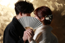 礼装の場合、扇子のことを末広と呼びます。それは、開いた形が末広がりになるため。おめでたいことの象徴になっています。おふたりの幸せを願ったショットです。