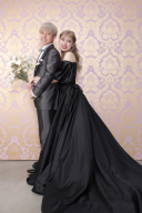 シックな背景にバラのような赤色のドレスが目を引きます モノクロの世界からおふたりはどんな色に染めるのでしょうか!