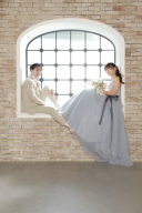 クールにきめた1枚。チャコールグレーの背景にウェディングドレスとグレーのタキシードはモノトーンでまとまっていて素敵でした。