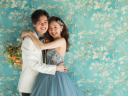 グリーングレージュのカラードレスと相性のいいブルーの壁紙でのお写真。仲良しなお二人らしい素敵な一枚になりました。