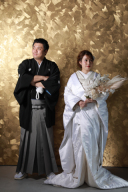 金屏風をイメージした背景での1枚です。立体感のある金地の背景での白無垢と黒紋服のお写真は一気にモダンなスタイルになります。お二人の柔らかい表情もポイントです。