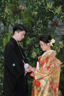 紋服で腕組み。新郎様の凛々しいお姿に寄り添う新婦様。仲の良さが垣間みられる一枚ですね。