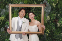 額縁を持ったお洒落な1枚です!背景のグリーンは立体感のある背景なのでお二人のご衣裳を際立たせてくれます!