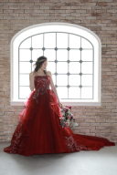 モノクロ背景と赤の色打掛はメリハリが出るお写真になります。シックな雰囲気がお好きな方にぴったりです。