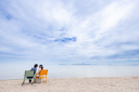 夏の青空に爽やかなグレーのタキシードとウエディングドレスがとてもお似合いです