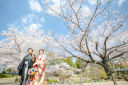 相楽園の門の前から撮影がスタートです!番傘もいいですね〜◎お二人とも未来を見つめていますっ♡